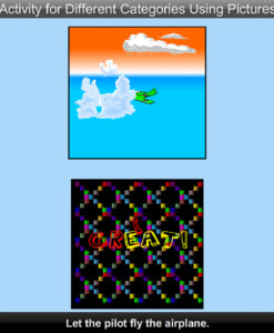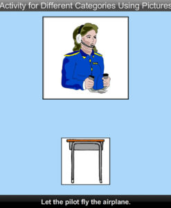 Here a person is shown at the top of the screen (except when there are animals). From one to three items (depending on the Level) are shown at the bottom of the screen. A command text (for instance, “Let the pilot fly the airplane”) and voice tell the student………