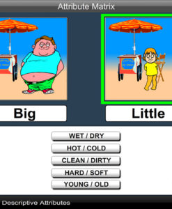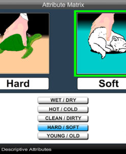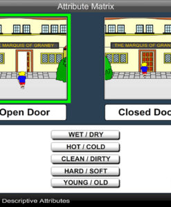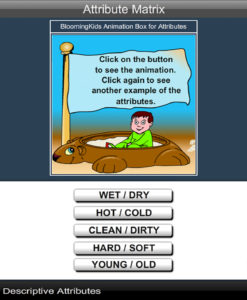 Attributes are shown here in fifteen pairs of opposite adjectives (called buttons). The fifteen pairs are stacked in a column on the left side of the screen. Two animations that illustrate the two attributes appear at the right side of the screen. The student can click any of these pairs………