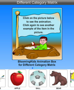Pictures of items from different categories are shown here bottom on the screen. When the picture click on the stage, an animation related to the picture plays in the box on the top of the screen. There are, in this program, two pictures and animations for each item……..