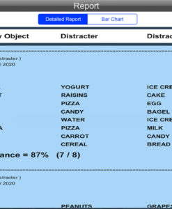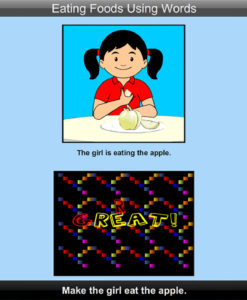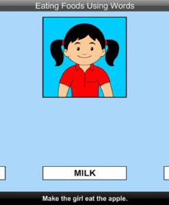 Here the student is asked to click on the correct food name shown (with/without distracter/s) at the bottom of the screen. After the student clicks on the correct name, it moves up, the boy/girl eats or drinks the food item, and the program congratulates the student………