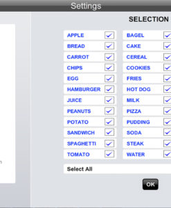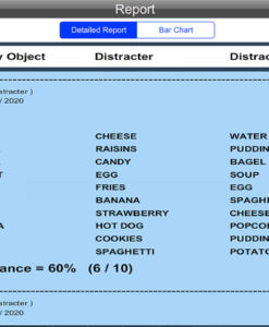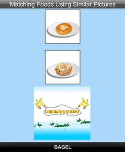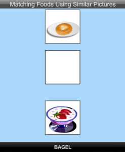 One food picture appears at the top of the screen. When this option is selected, three pictures are shown at the bottom of the screen to be matched with the one at the top of the screen. There is one correct choice and two distracters. You can choose a Food, Non-food, or Mixed distracter……….