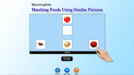 One food picture appears at the top of the screen. When this option is selected, three pictures are shown at the bottom of the screen to be matched with the one at the top of the screen. There is one correct choice and two distracters. You can choose a Food, Non-food, or Mixed distracter……….