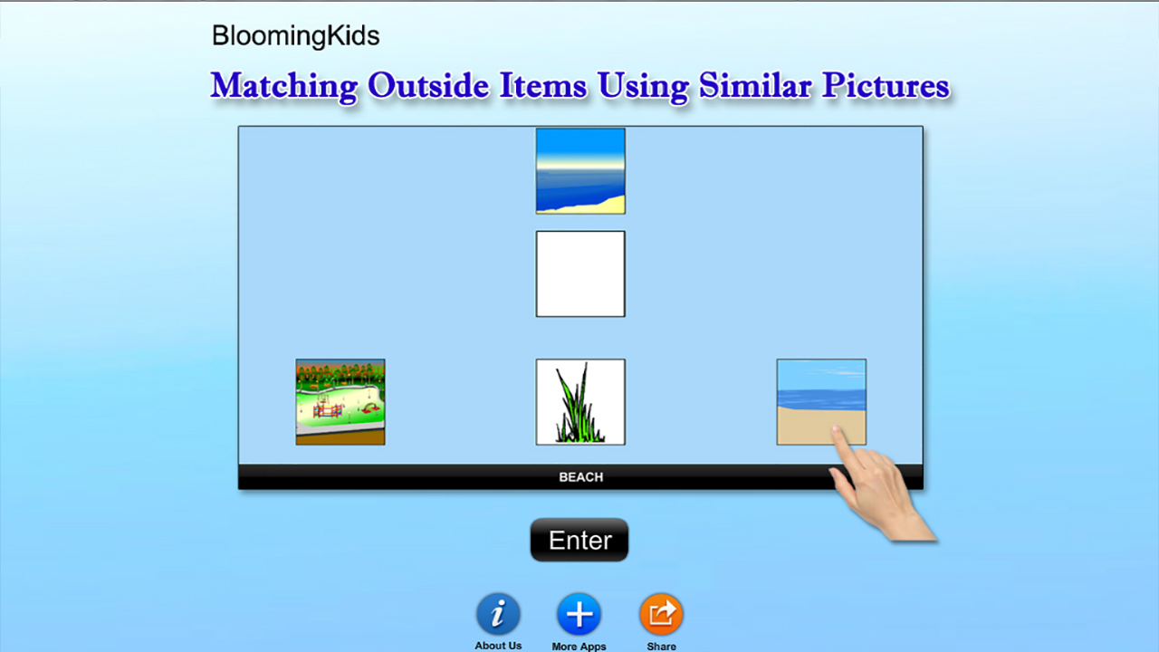 When this option is selected, one outside item appears at the top of the screen. One outside item picture is shown at the bottom of the screen to be matched………..