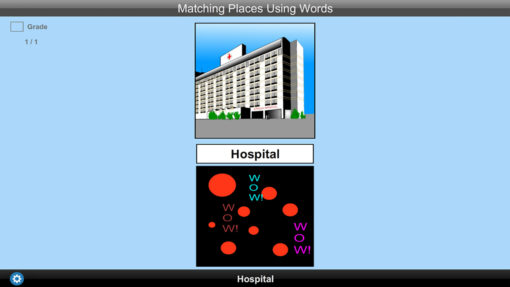 The student is required to click on the correct word, which represents the place shown at the top of the screen.