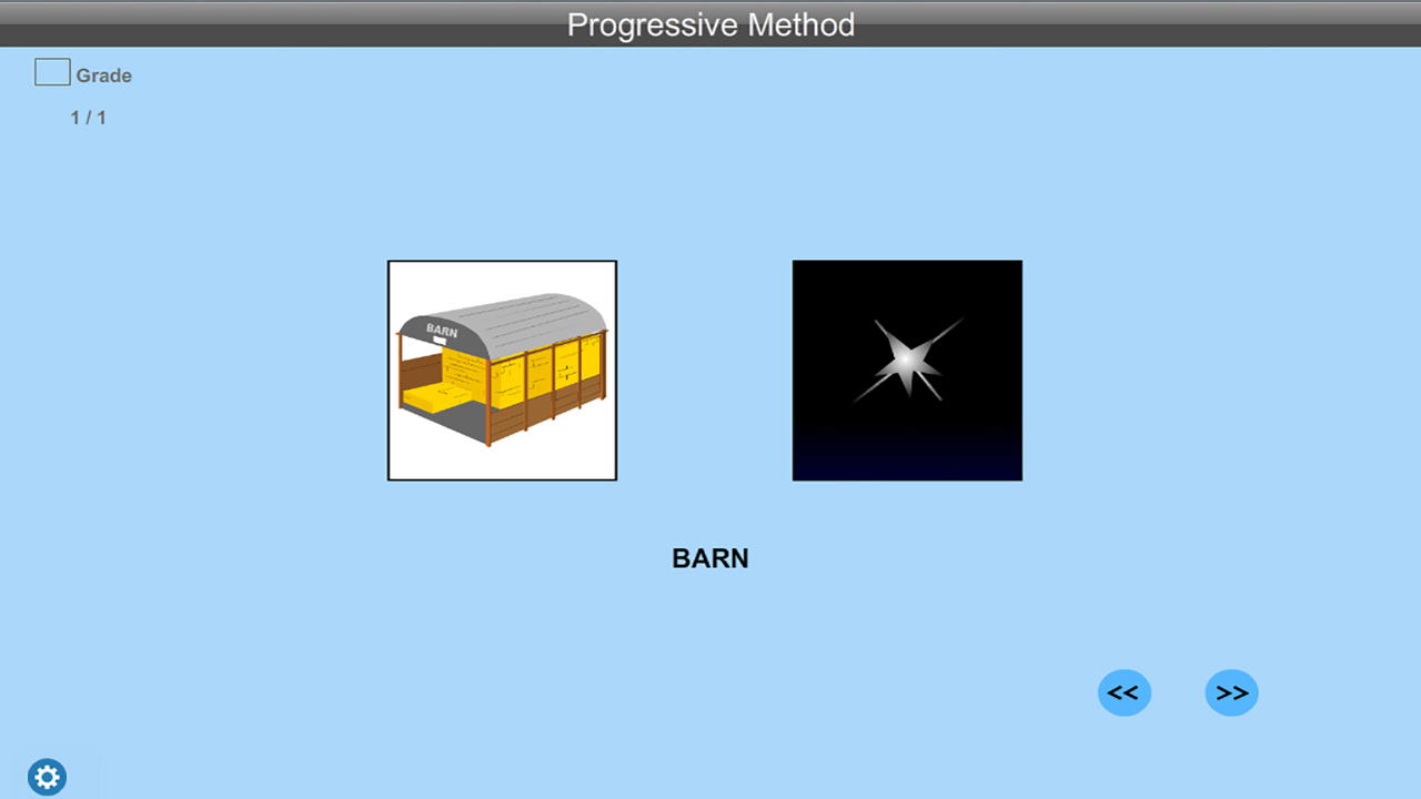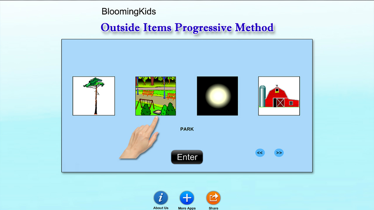 This “Progressive Method” is designed to introduce the outside items to the student one by one. This method allows the student to master the outside items’ names gradually.