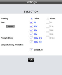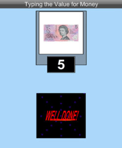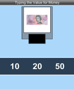 Here, the student has to click or type the value (from the box in the bottom of the screen) of the coin or note shown in the picture at the top of the screen. The value will then appear under the picture……