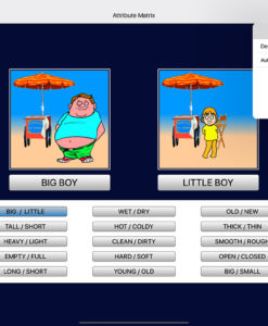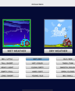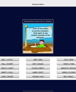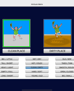 Attributes are shown here in fifteen pairs of opposite adjectives (called buttons). The fifteen pairs are stacked in a column on the bottom of the screen. Two animations that illustrate the two attributes appear at the top……….