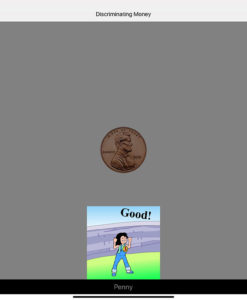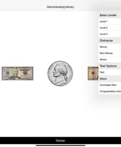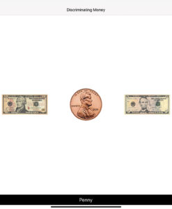Three pictures of coins or bills appear on the screen. The program voice says (for instance) “Find Dime.” The student chooses the dime from one, two, or three items on the screen.